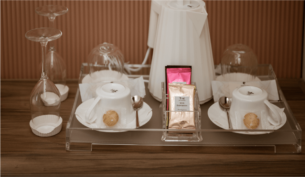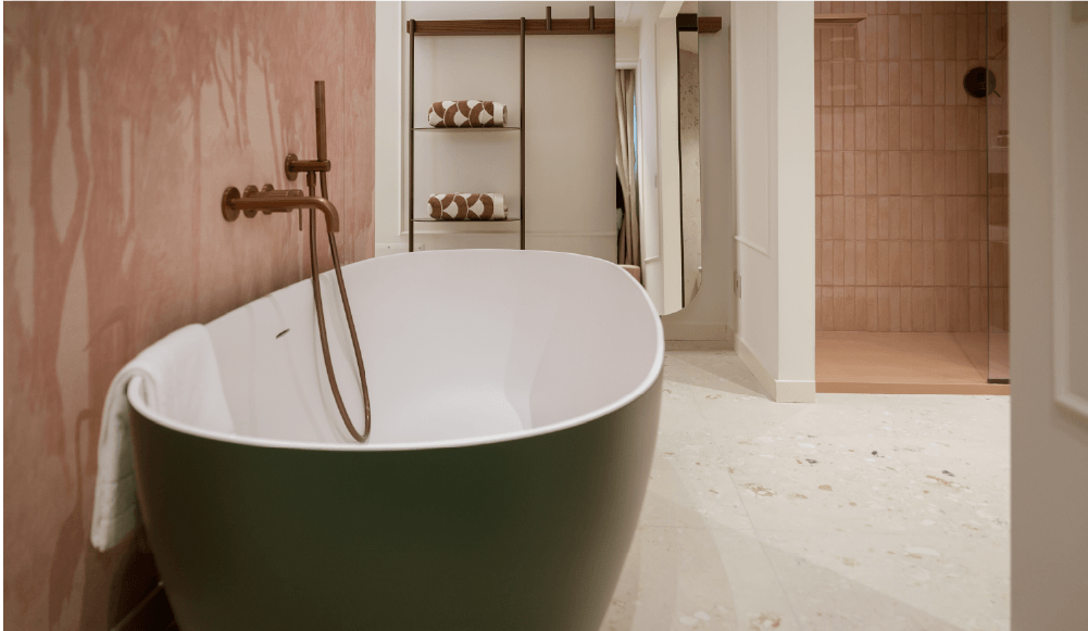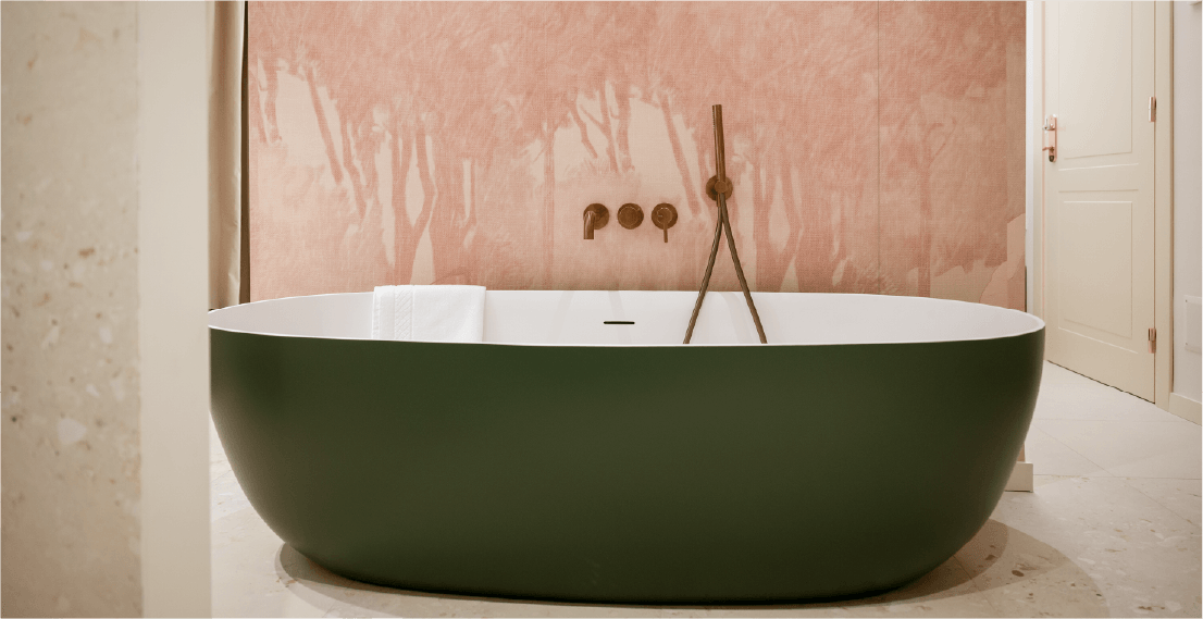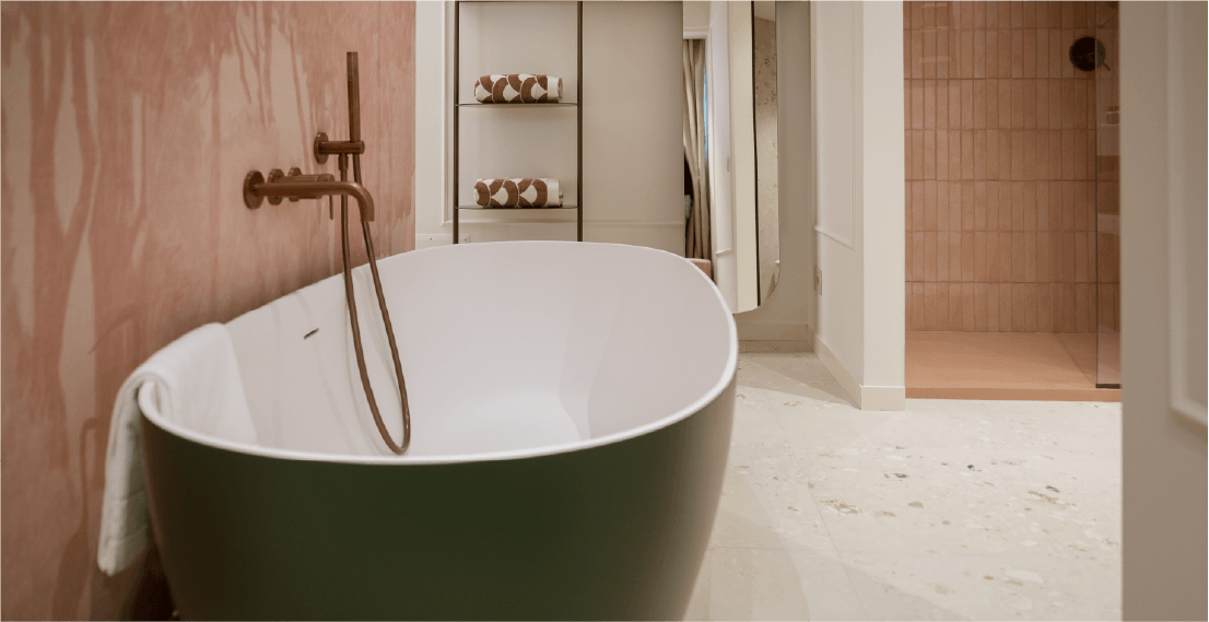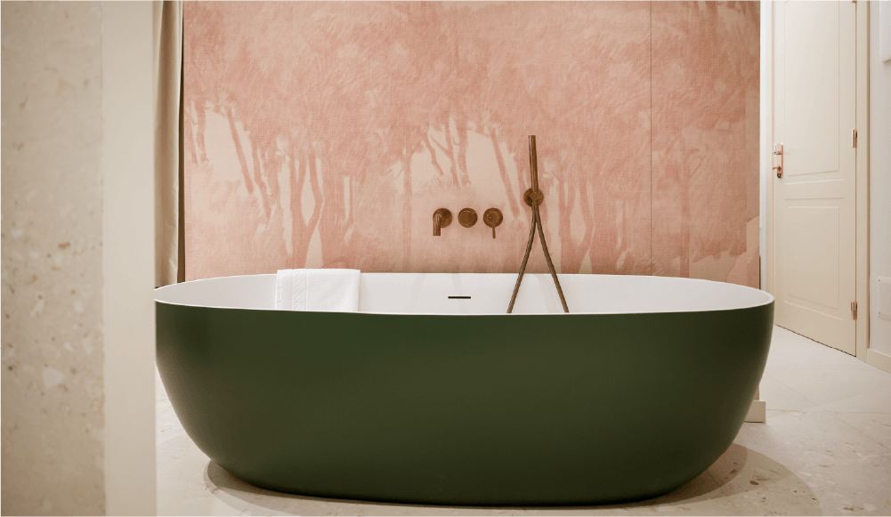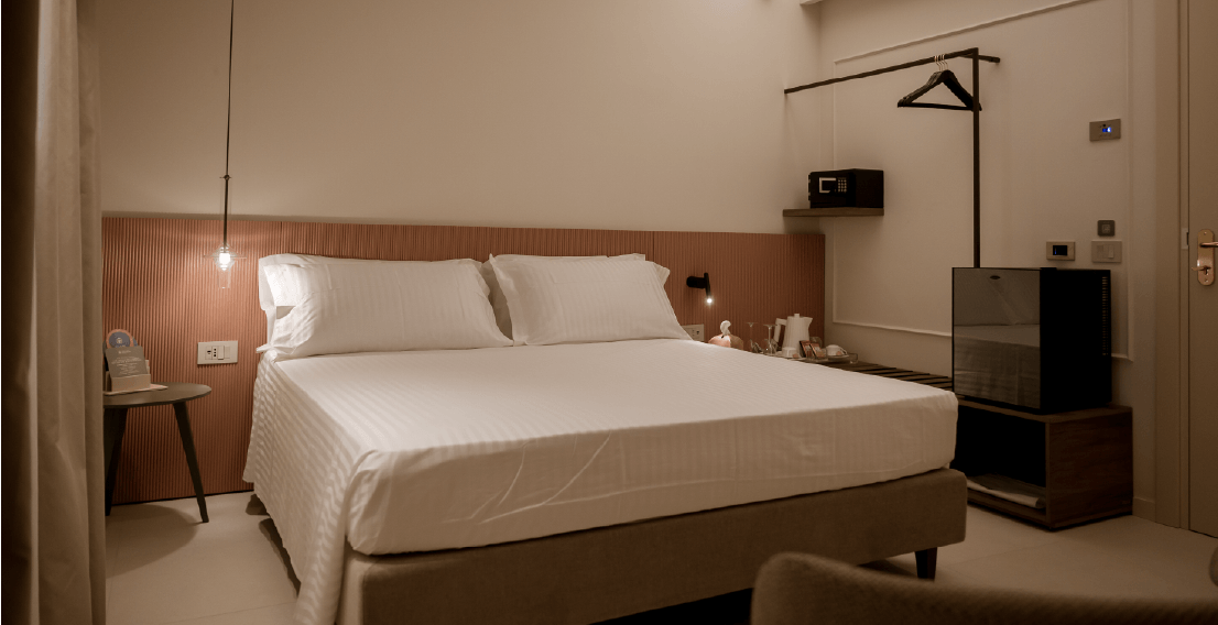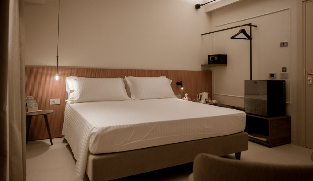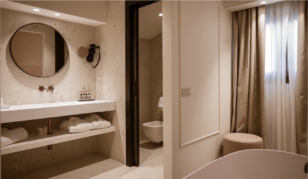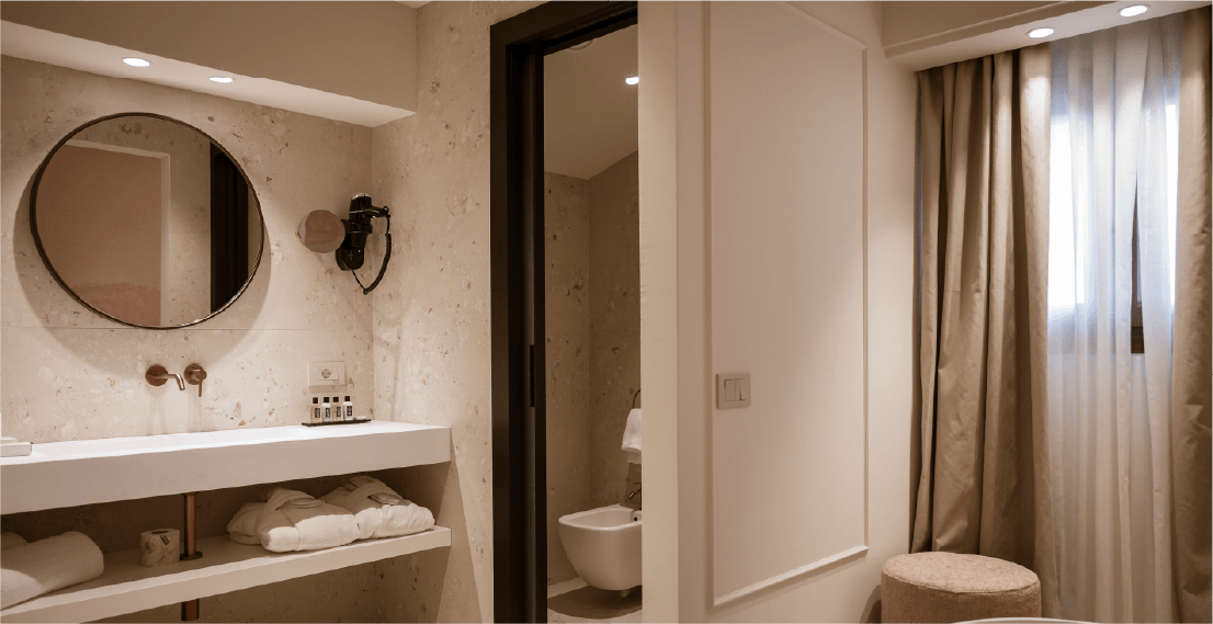 Dal design ricercato in stile classico contemporaneo, progettata per accogliere due persone. Una parete centrale impreziosita con carta da parati suddivide lo spazio in due ambienti per una superficie totale di 21 mq. La sala da bagno finestrata ospita la vasca freestanding e la doccia.