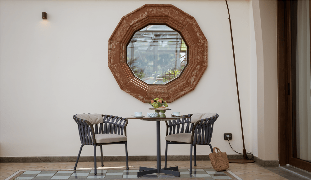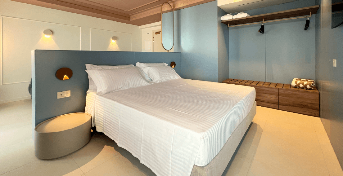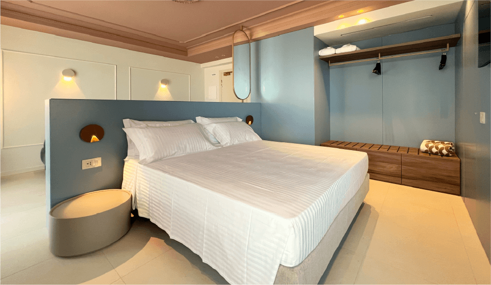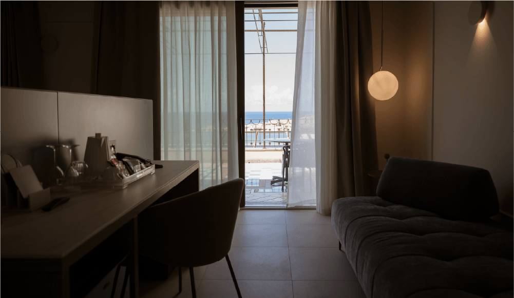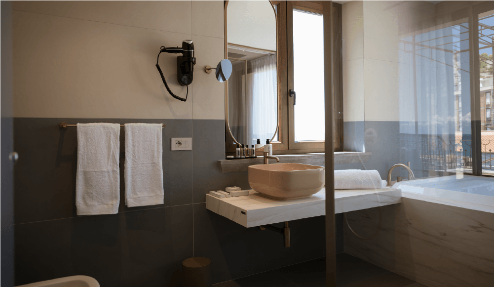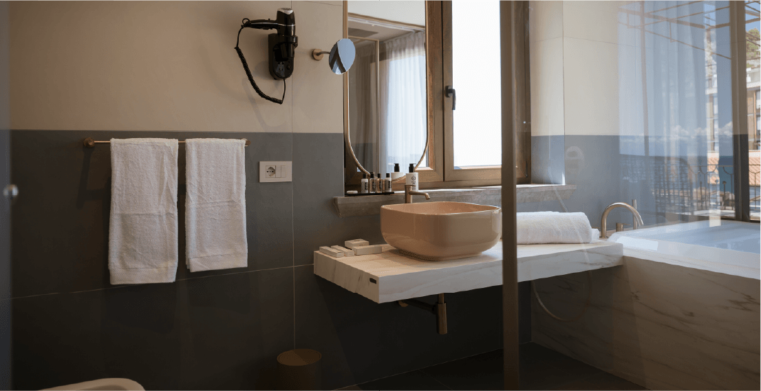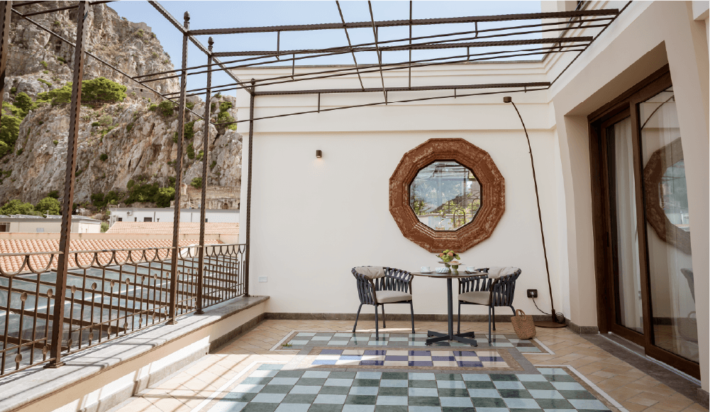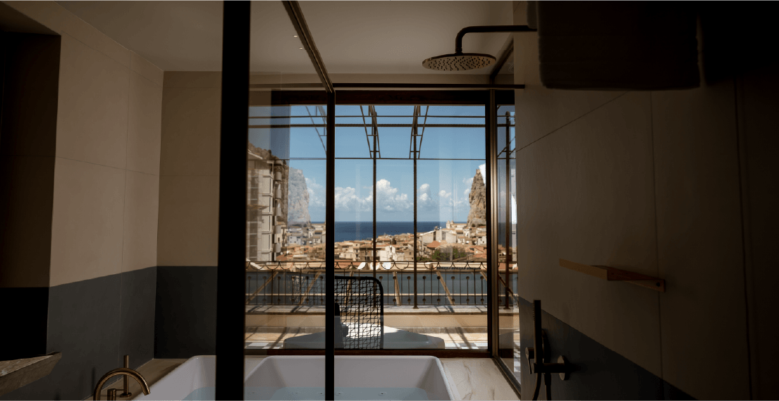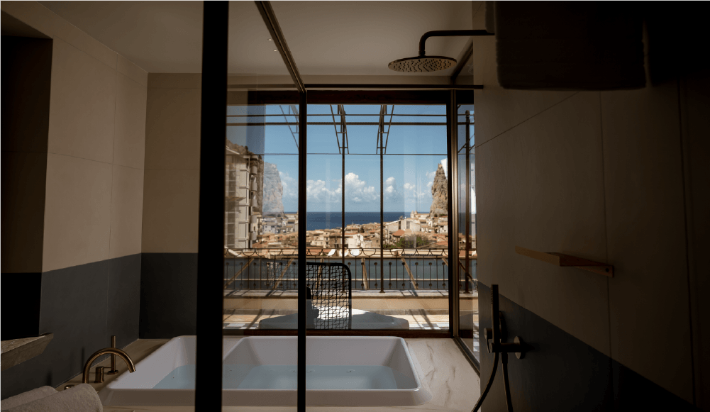 Le ampie vetrate permettono l’accesso sul terrazzo privato vista mare caratterizzato dalle tipiche ceramiche artigianali di Fratantoni. Il bagno vetrato ospita una vasca idromassaggio per due persone.