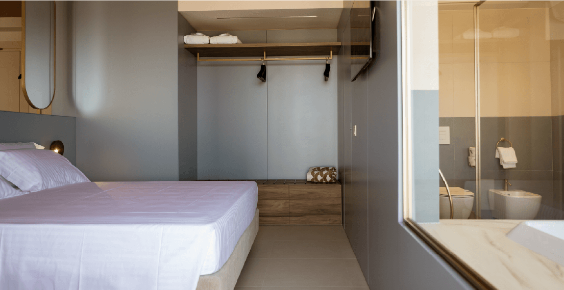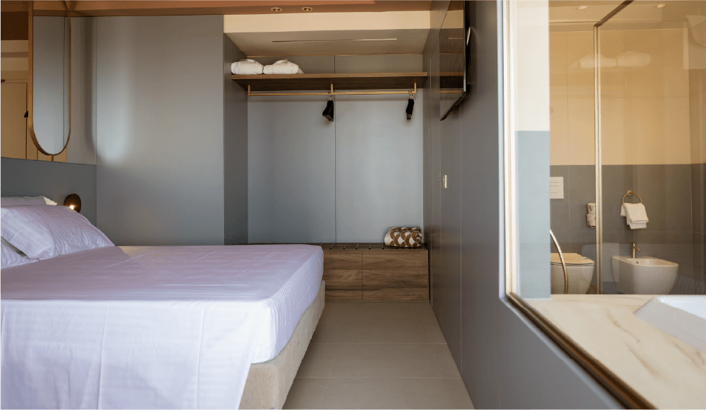 La posizione centrale del letto matrimoniale suddivide lo spazio in due ambienti con una superficie totale di 25 mq.