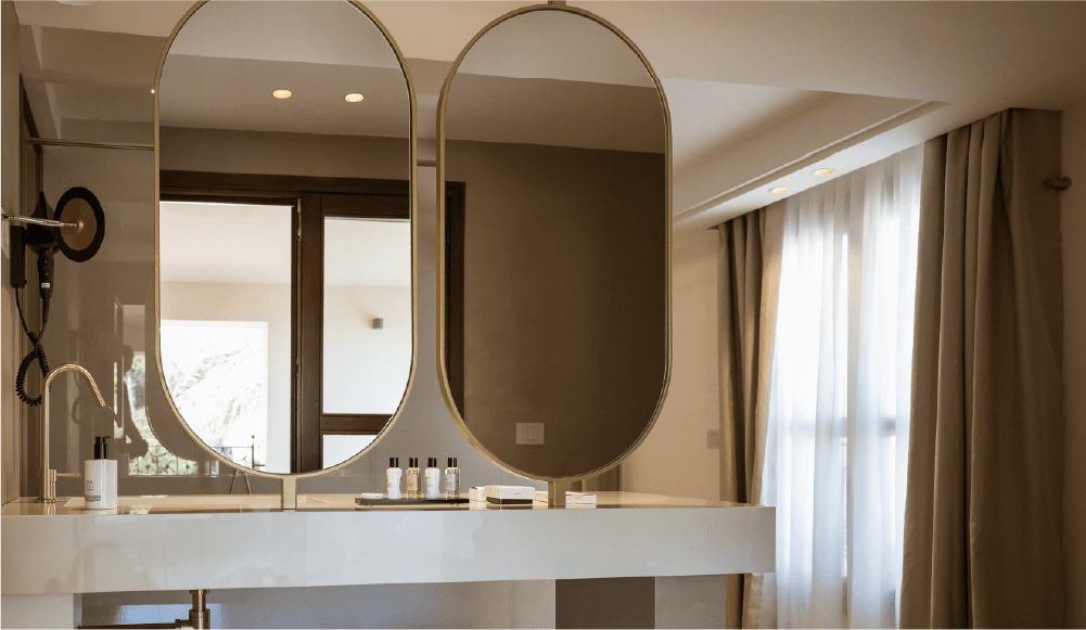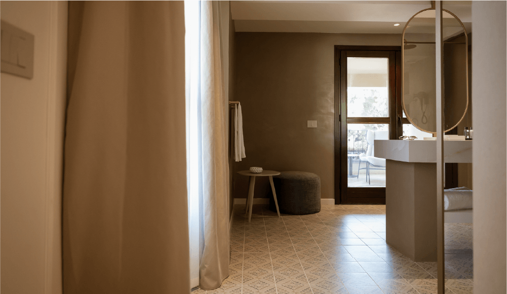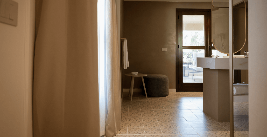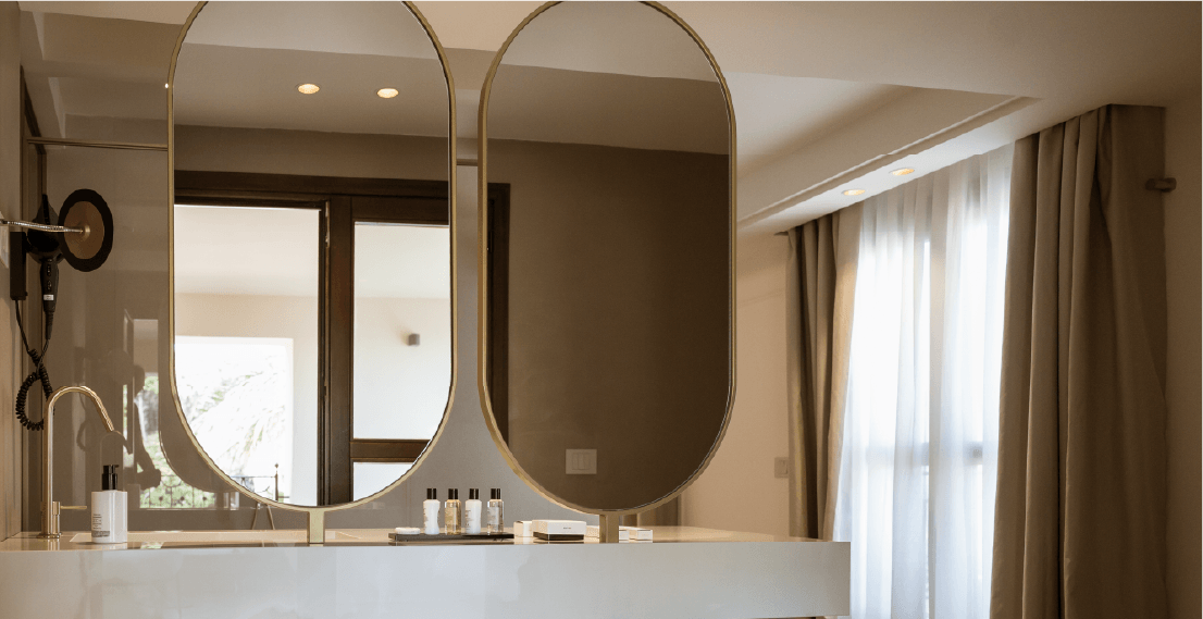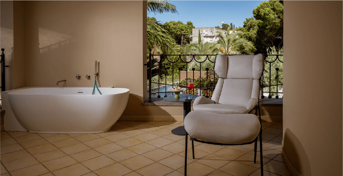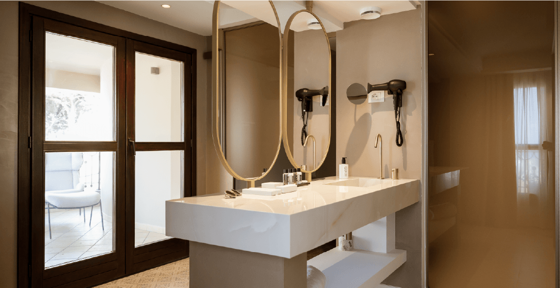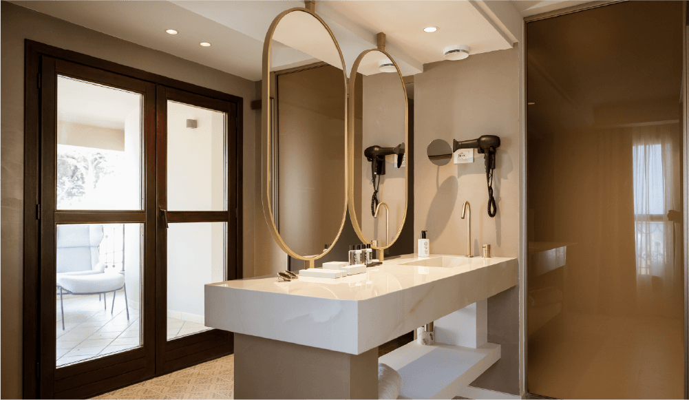 La sala da bagno vista mare, ospita un’ampia doccia con particolare lavabo a penisola e dà accesso al terrazzo privato con vasca idromassaggio.