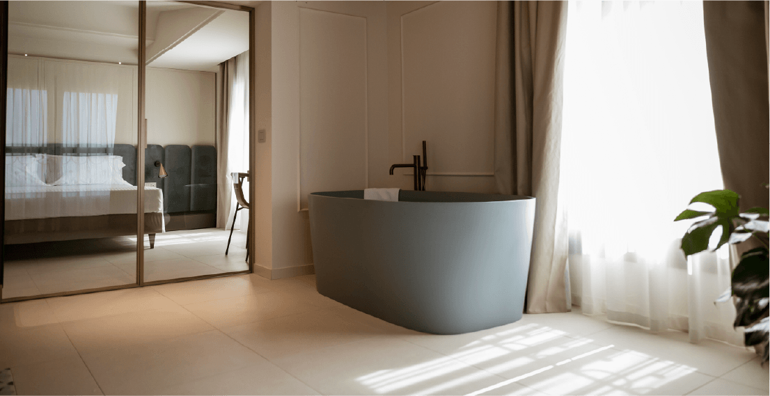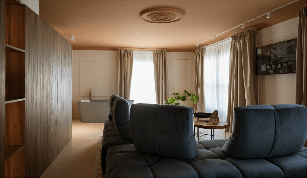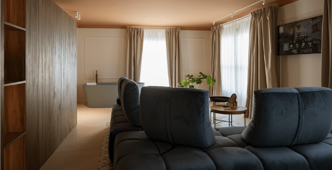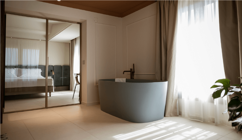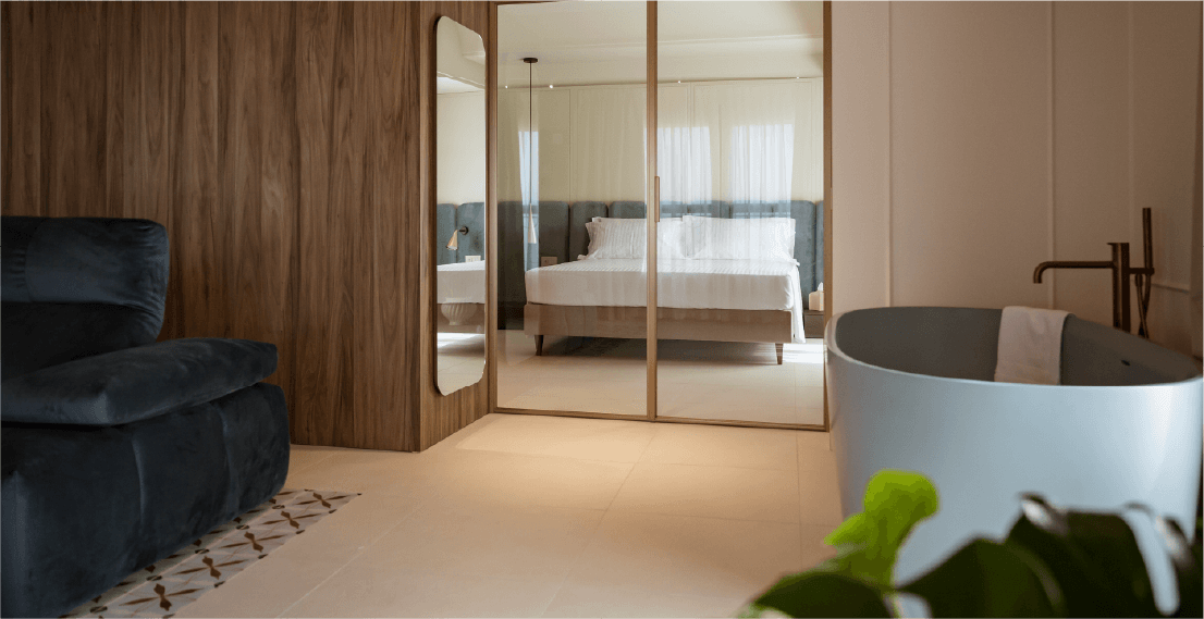 Il primo ambiente soggiorno è caratterizzato da ampie vetrate su tre lati vista mare, un divano e una vasca freestanding.