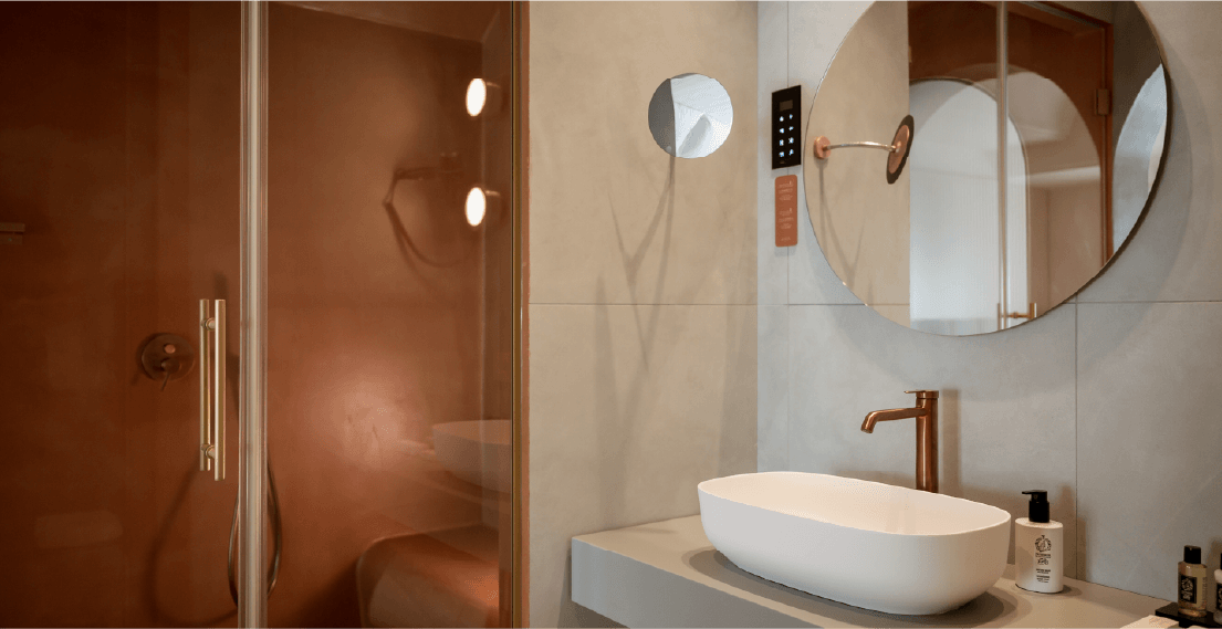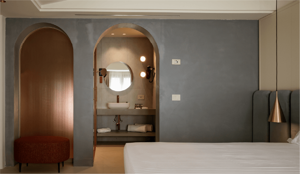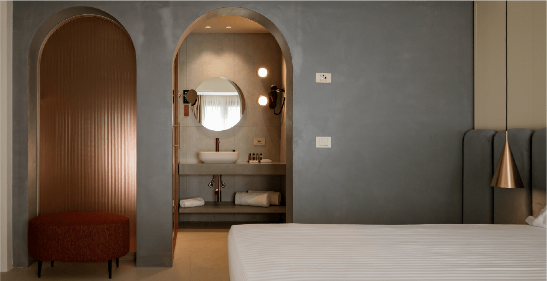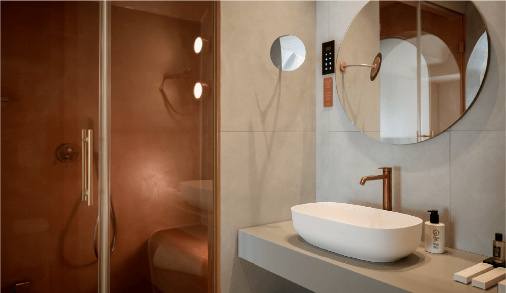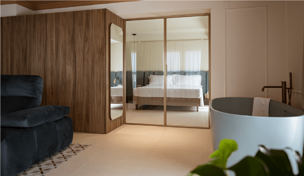 Nel secondo ambiente si trovano il letto matrimoniale e il bagno privato con grande doccia e bagno turco.