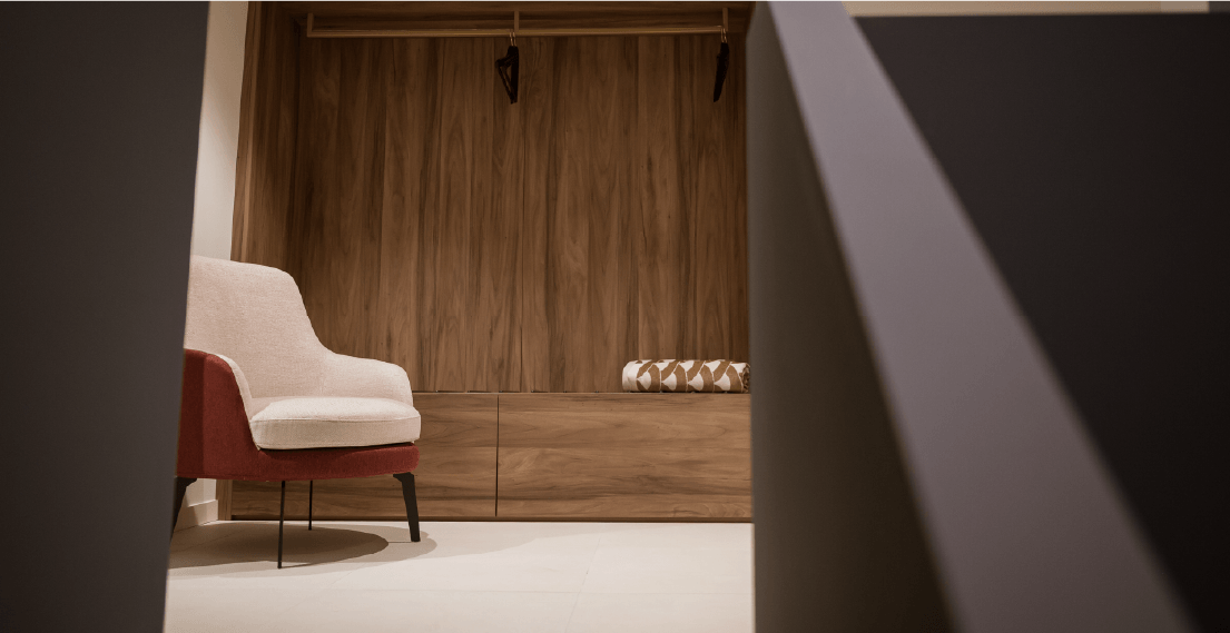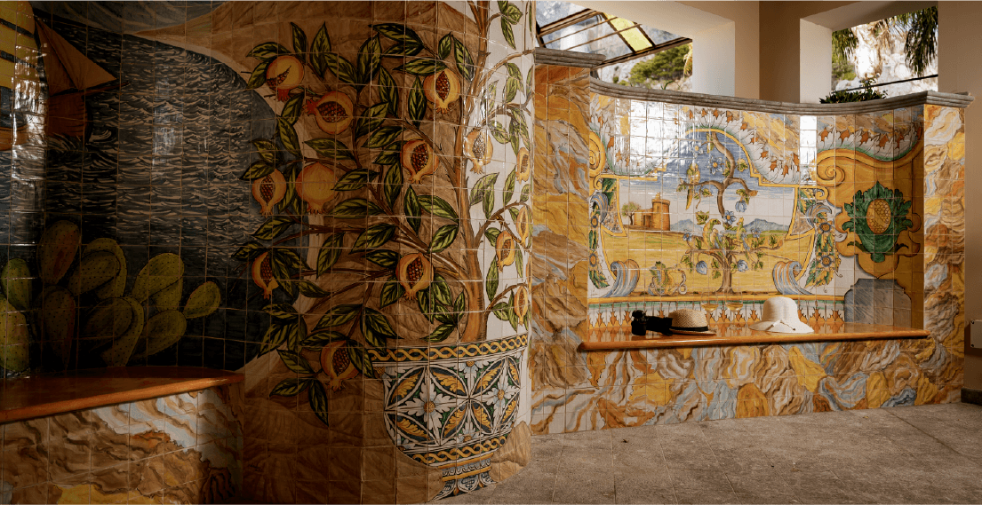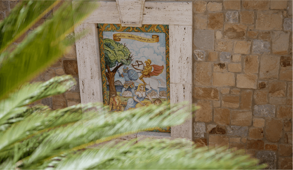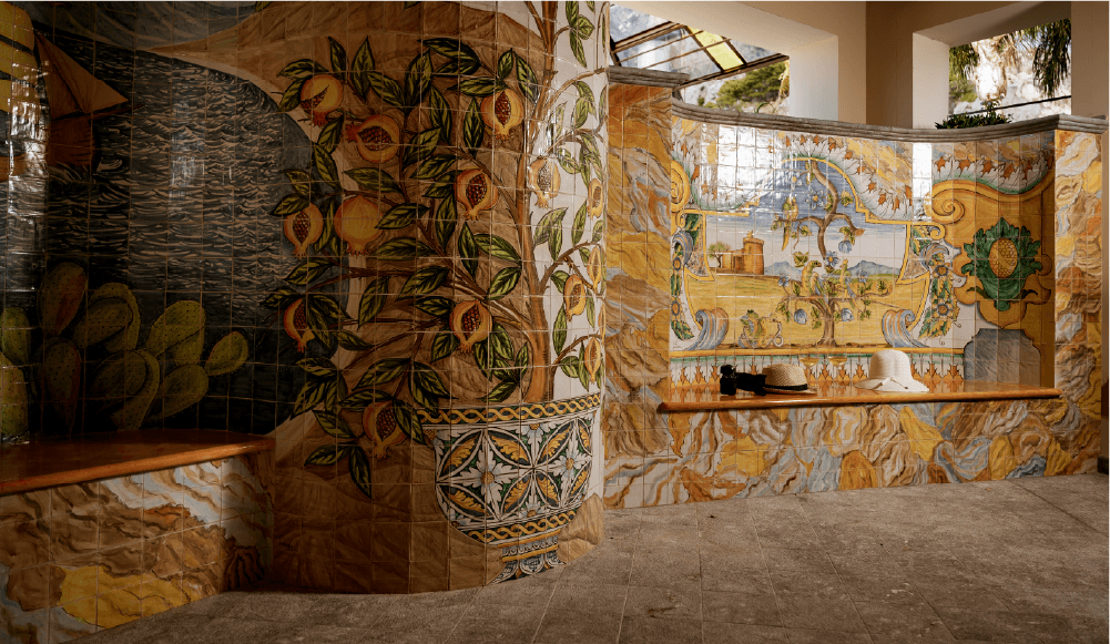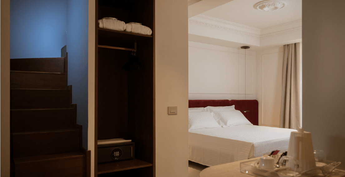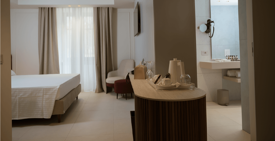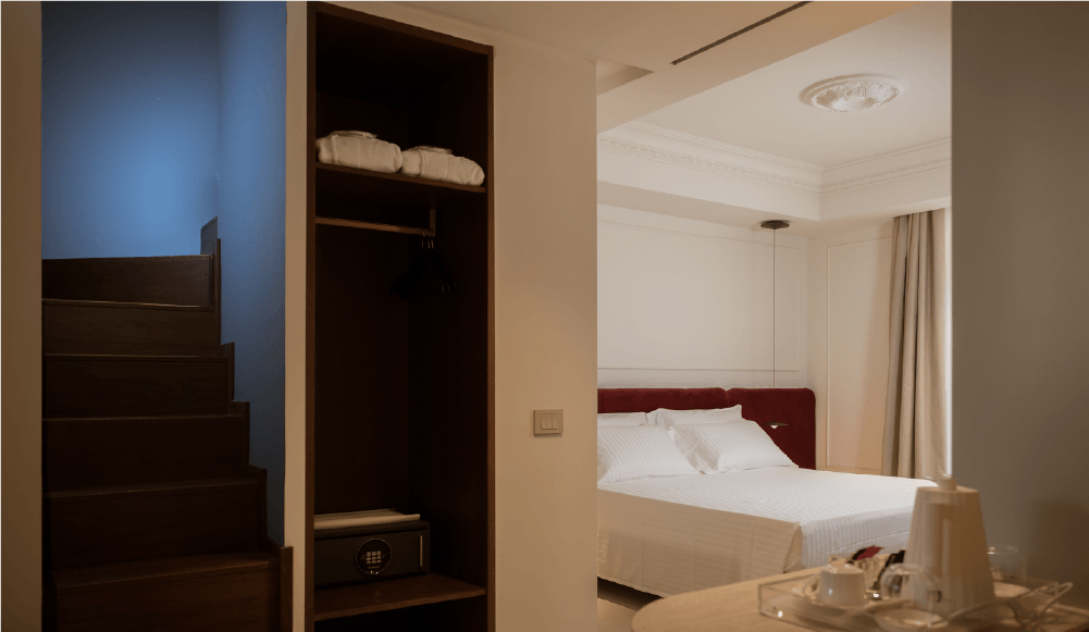 Al primo livello un letto matrimoniale, un ampio bagno con doccia e zona make up ed terrazzo privato con vista piscina caratterizzato dalle tipiche ceramiche artigianali di Fratantoni.
